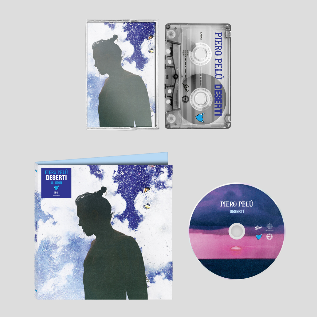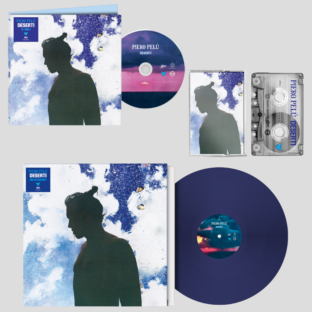 DESERTI è disponibile in esclusiva sullo Store di Piero, nello speciale formato MUSICASSETTA in versione LIMITATA. Qui disponibile in bundle con il VINILE BLU TRASPARENTE.